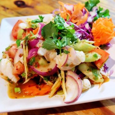 Scallops, Shrimp, Calamari, Mussel with Green Onion, Tomato, Celery, Cilantro and Chili lime Dressing